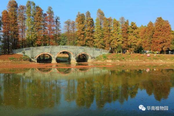 科普信息中心前三拱桥边的落羽杉,现在颜色最为丰富,绿叶、黄叶、红叶共存,树丛倒影水中层林尽染。