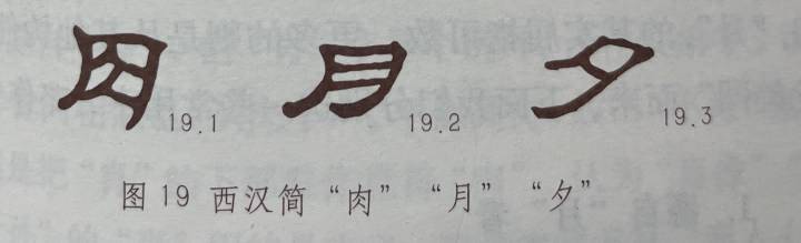 到了西汉,隶书“肉”被进行了改造,与“月”进行了很大的区分,中间两横往上折。有了下图对照,今天“肉”里的“人”形,大家就知道哪里来的了——正是始于汉隶。