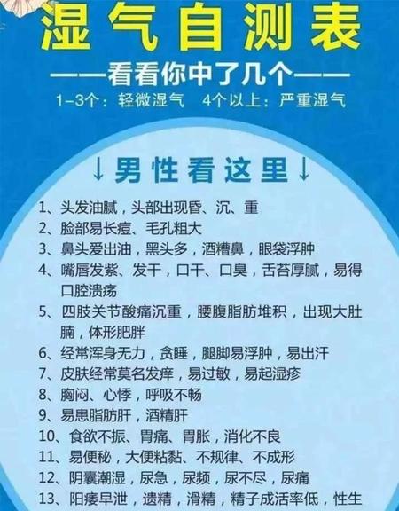 男人体内湿气重的主要表现有以下10个,快来对照一下吧: