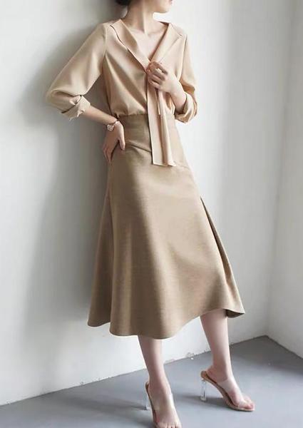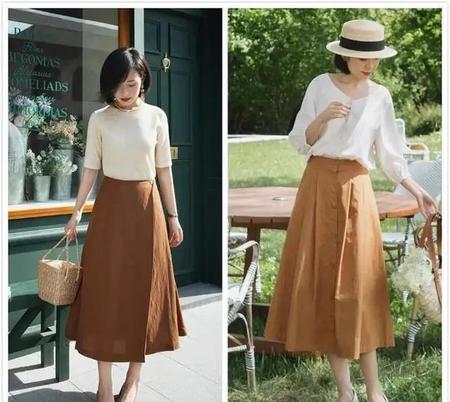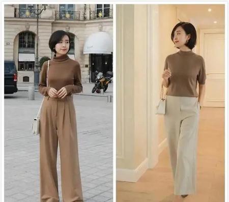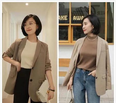 更浅色些的咖色,和杏色或者奶油白的衬衣,也是一样好搭。同色系的搭配,虽然略微不同,或者深浅色系搭配,但就是有种浑然天成的融合感。