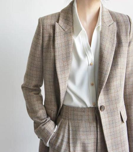 看过了大表姐的深咖色女神搭配示范,我们来看稍微浅的浅咖色系,这套浅咖色格纹套装,除了可以搭配前面的白色衬衣,还可以搭配杏色的衬衣,这套浅色系咖色搭配,则更适合御女范小姐姐。