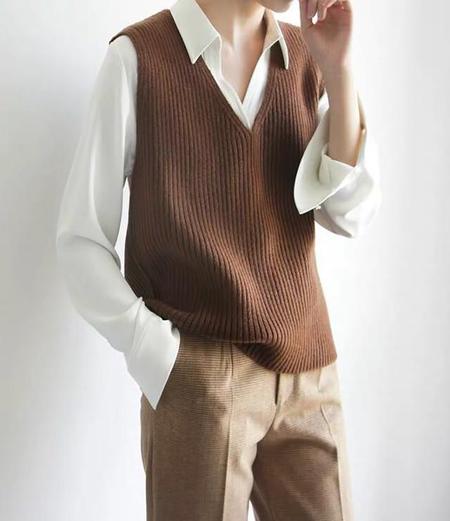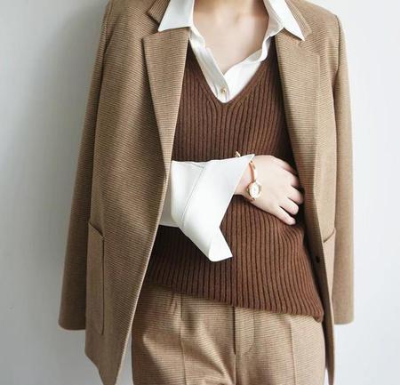 最近正流行的针织背心,V领棕色显得沉稳又文气,里面搭配白色衬衣,既适合秋天保暖,又干净利落。既符合职场穿搭,又文艺温暖,即便是最简单的白色衬衣,也能穿搭得十分好看。