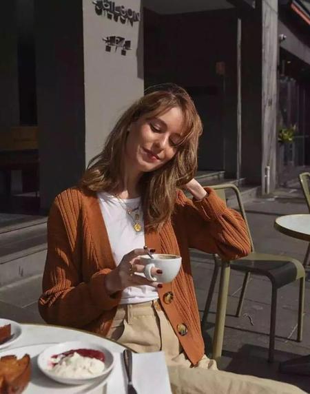 其实外国博主还是很青睐咖色系的,用咖色系针织衫搭配白色T恤,休闲又高级。和柔软的棕色系发色,看起来和谐又美好,满足地享受秋天的煦阳~