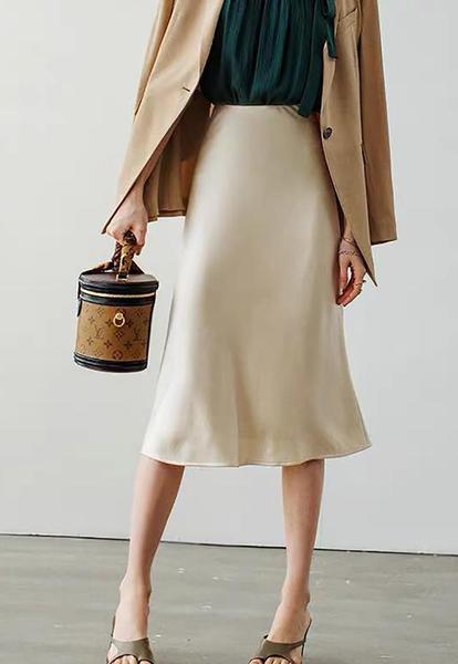 浅咖色系还可以和墨绿色搭配,这套浅咖色外套和半裙,和绸质的墨绿色搭配,也是别有风情。橄榄绿的凉鞋和墨绿的上衣呼应,也是搭配得既养眼又时尚。