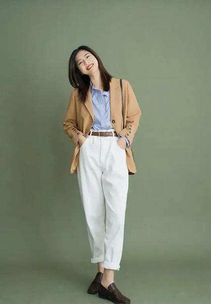 当然,咖色系可以搭配得青春活泼些的,比如这套蓝色衬衣+白色锥形裤,就更加明媚,深咖色只是用于纽扣、小包、腰带和皮鞋这种细节上的小点缀,既相互呼应,有显得高级好看~