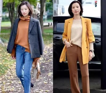 等天冷了,或者早晚气温低,外面搭配一件稍浅咖色的西装外套,御姐范十足。白色的领口、袖口既让脸和手等露肤的地方衬得显白,针织衫和浅咖色西装相映成一体。