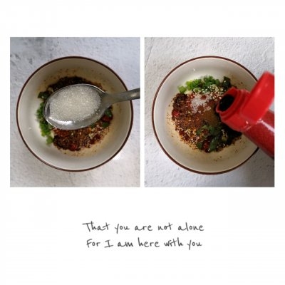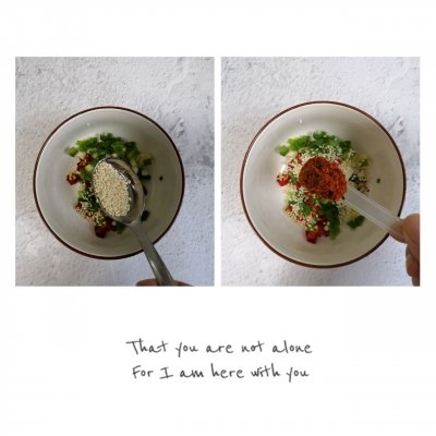2、加入两勺白芝麻,两勺辣椒;