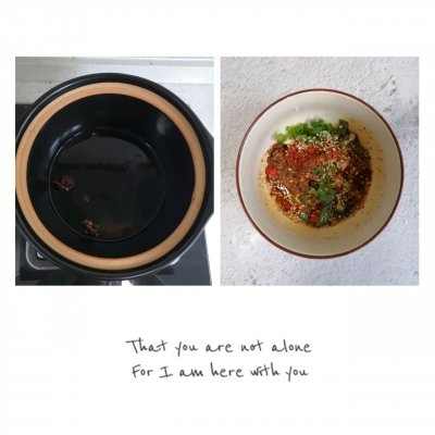 3、油里加入几颗花椒八角炸一下,热油泼在上面;