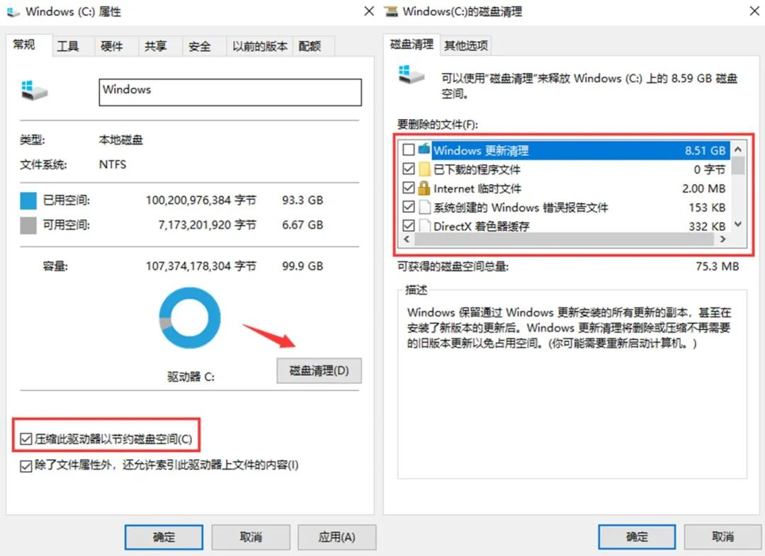选中C盘右键打开菜单,点击「属性」选择「磁盘清理」,然后全部勾选上。下方的「压缩此驱动器」也一起勾选选。