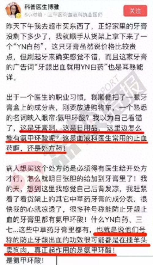 据江苏新闻广播报道,10月21日,网名为“科普医生博雅”的网友发表文章称:云南白药牙膏中含有止血功效的西药成分“氨甲环酸”,而不是云南白药,这些所谓防止牙龈出血、止血的“中药牙膏”,其实都是在挂羊头卖狗肉,起到真正作用的,是西药“氨甲环酸”。“科普医生博雅”还质疑,氨甲环酸是处方药,添加到日用品中可能涉嫌违法添加。