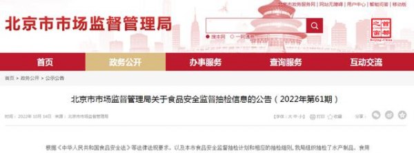 中国质量新闻网讯 近日,北京市市场监督管理局发布关于食品安全监督抽检信息的公告(2022年第61期)。
