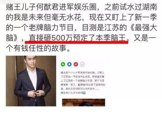 第二个质疑点是有人爆出他砸了500万预定《最强大脑》冠军。