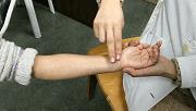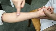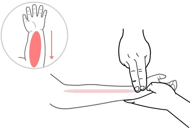 先用右手拇指运内劳宫,再用食、中二指的指腹沾凉水,从腕横纹循天河水向上弹打至肘横纹(从总筋穴、内关穴、间使穴循天河水弹打至曲泽穴)。