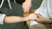 用左手托住孩子的前臂和手腕,使他的手掌心向上。