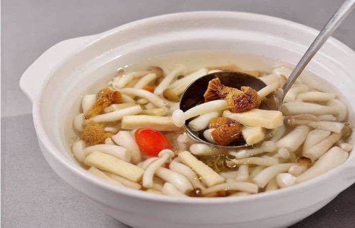 菌汤中的原料之一茵类食物含有蛋白质、碳水化合物、粗纤维、多种维生素和氨基酸,还有钙、铜以及磷等微量元素。一般菌菇都具有提高机体抵御各种疾病的免疫力、抑制肝脏内胆固醇增加,促进血液循环,有降血压、滋养皮肤等作用。