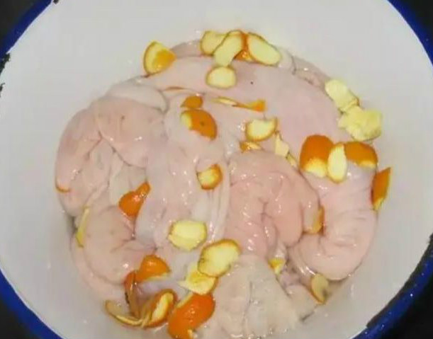 技巧二,猪大肠清洗干净后,放入盆中,加入少许的橘子皮,然后用手将橘子皮跟猪大肠不停的揉搓,大约揉搓5分钟左右后,再倒入少许的的白醋继续揉搓一分钟,最后用清水冲洗干净即可。