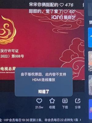 随着事件发酵,越来越多的网友开始控诉爱奇艺:不只是限制投屏,连通过HDMI线链接电视播放都无法使用艺能!更奇葩的是,电视上能够显示软件界面,但是播放视频资源就会立刻显示“由于版权原因,此内容不支持HDMI连线播放”。为此艺,爱奇艺回复是“应版权方要求”,显然这样的回复是难以服众的。