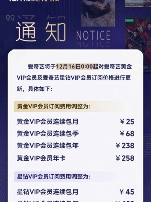 会员分级、一次次缩减会员服务还不是终点,就在vip上个月,爱奇艺才宣布提高了会员价格,黄金、星钻等会员档位都有不同程度上浮。其实早在2025年11月、2025年12月,爱奇艺在每年年底都会涨一次价,本来会员价格相对较低的它,也让优爱腾三家的会员费是什么用来到同一水平线。