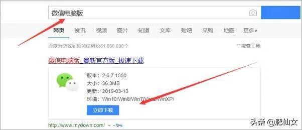 1、首先在电脑上打开浏览器,在搜索栏中输入“微信电脑版”,然后选择“立即下载”。