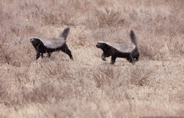 为什么很多大型的动物都怕它,那是因为蜜獾的牙齿锋利,凶狠异常,不是你死就是我亡,最重要的是你从任何角度攻击它都会被它反咬一口,因为它的毛皮与肌肉之间非常松懈,任何部位受到攻击它都会轻而易举的扭转身体进行反攻,这就意味着对手在它面前占不到任何便宜!只能被它多咬几口!