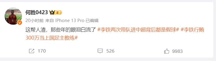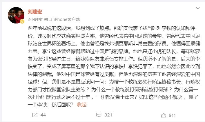 "但我所不了解的是,后来的李铁变了,变成了屏幕里的那个我不认识的李铁!李铁犯罪了,他也必然会因此收到法律的制裁。他对中国足球曾经有过贡献,但他也深深的伤害了他曾经深爱的中国足球!但,我们是不是更应该问一问:为啥一个教练必须行贿足协秘书长,行贿权力部门才能做国家队主教练 ?为什么一个教练说打假球就能打假球?如果这些问题不解决 ,抓了一个李铁,那后面呢?" 他写道。