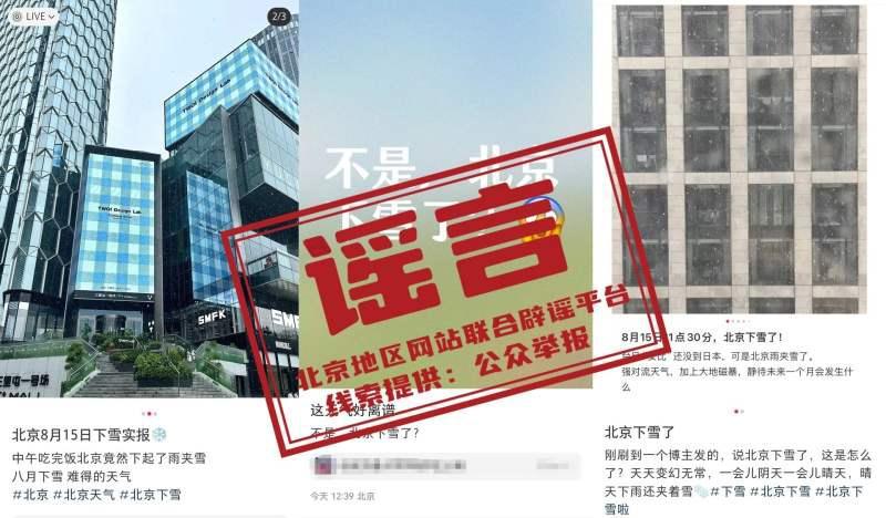据北京网络举报消息,8 月 15 日,有多名网友在社交平台发帖称 " 北京下雪了 ",并配发图片、视频。