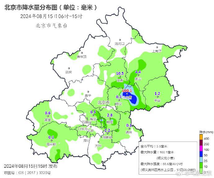 据 @气象北京消息,15 日 06-15 时全市平均降水量 3.5 毫米,城区平均 6.1 毫米,最近一小时最大降水量为东城龙潭湖,33.6 毫米。