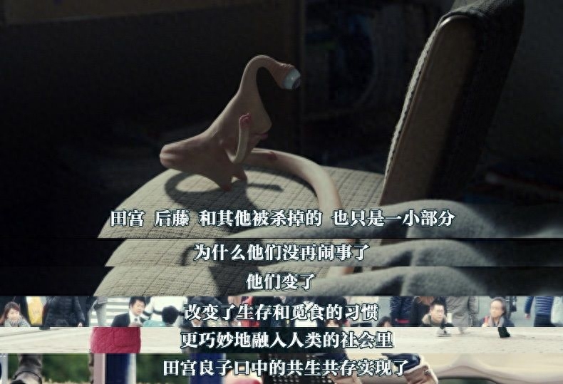 接近影片的结尾,小右告诉新一,寄生兽已经不再需要靠吃人生存,和人类的共生共存实现了。