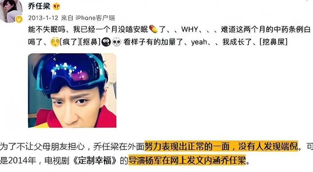 原因乔任梁患有严重的抑郁症,在2013年任乔梁就在平台上发文:能不失眠吗?我已经吃了一个月的安眠药,难道这两个月的中药调理白喝了?每天要吃好多安眠药才能入睡。经纪公司透露曾为此帮他推掉很多工作。