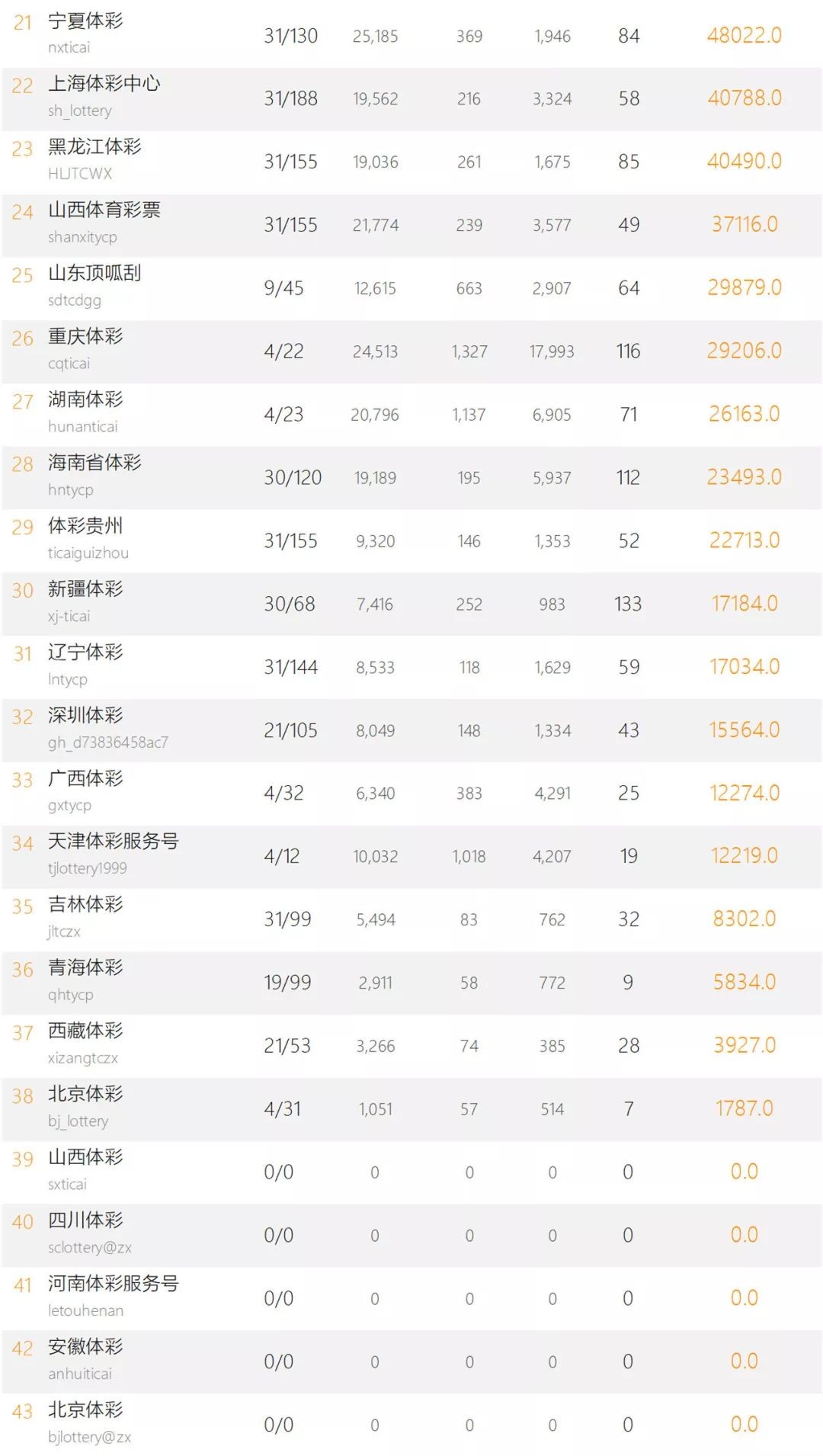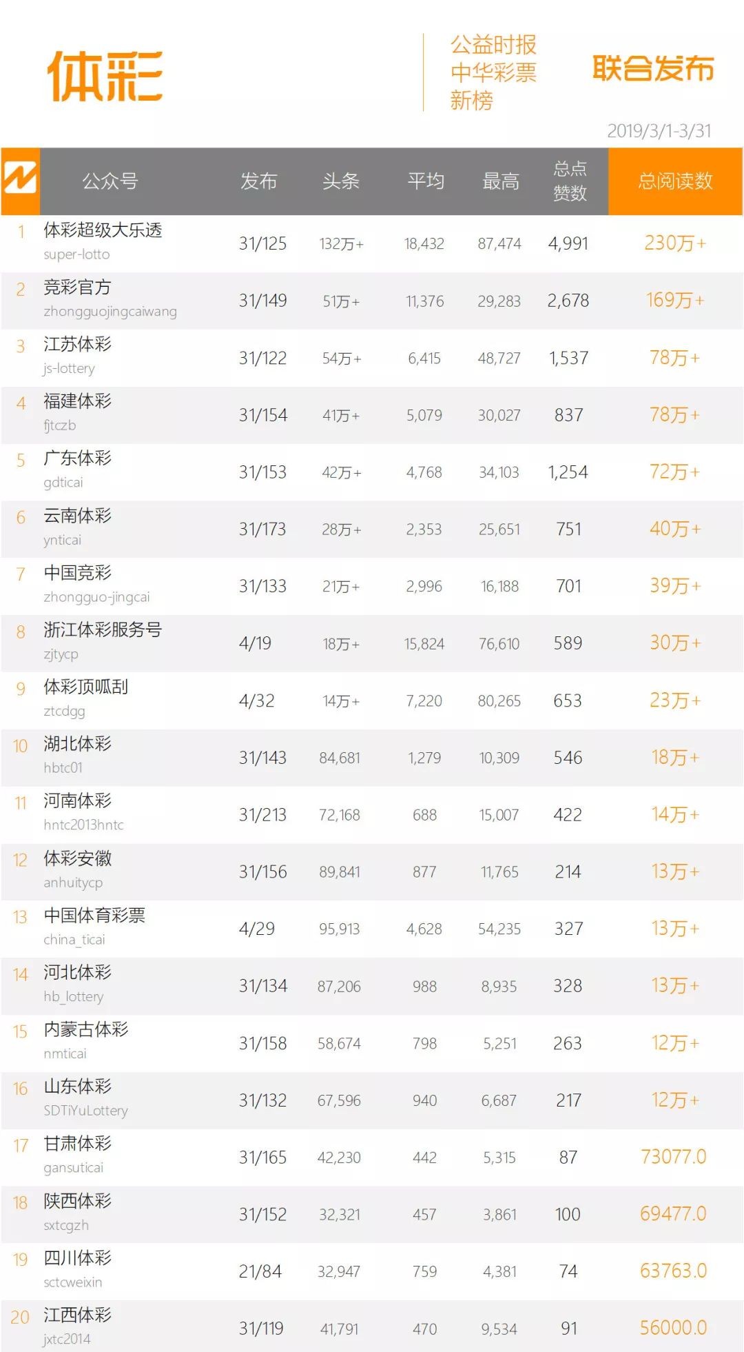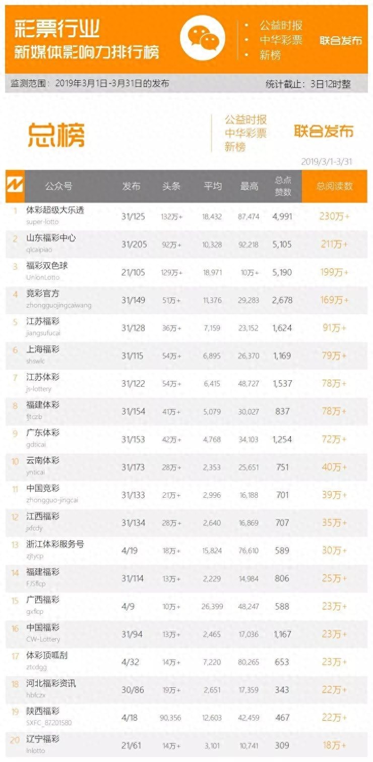 公益时报中华彩票网今日发布“彩票新媒体排行榜”2019年第3期,榜单由各地福、体彩中心服务号和订阅号组成,通过各公众号每月数据生成榜单,本期榜单的监测时间为3月1日-3月31日。