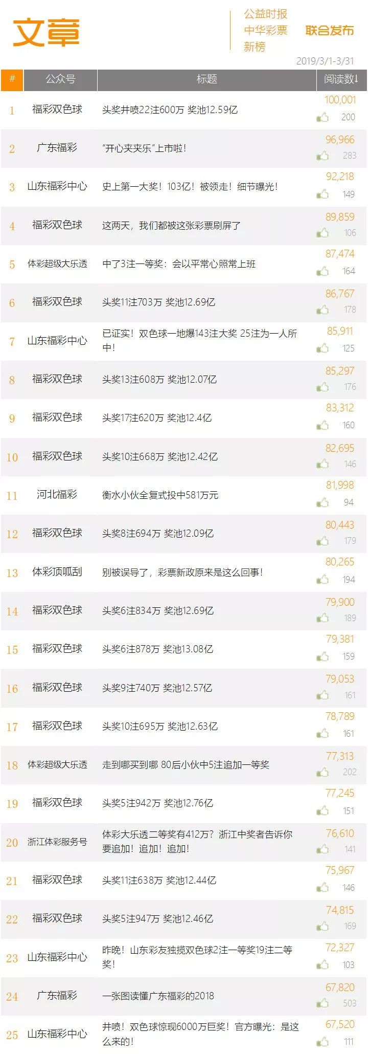 体彩超级大乐透总阅读数超过230万次,排名第一。3月份每天发布,共发文125篇,其中头条文章阅读数超过132万次,占总阅读数的50%以上。