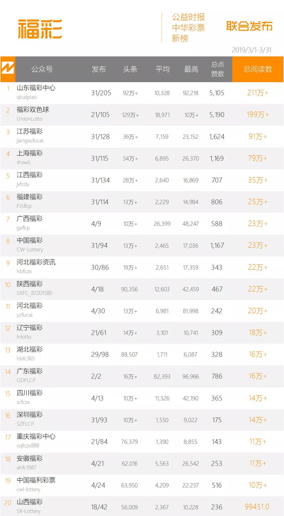 2019年第3期榜单,前20名中有11家福彩公众号上榜,其中山东福彩以211万阅读数蝉联福彩公众号榜首,总榜第二位。福建福彩和河北福彩资讯首次进入总榜前20名。