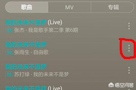 4、等待一会,会看到该软件搜索出来的相关歌曲以列表的形式出现,如下图所示。如果想下载第二首张雨生的《我的未来不是梦》,需要点击该首歌曲名称后的“三点”图标。