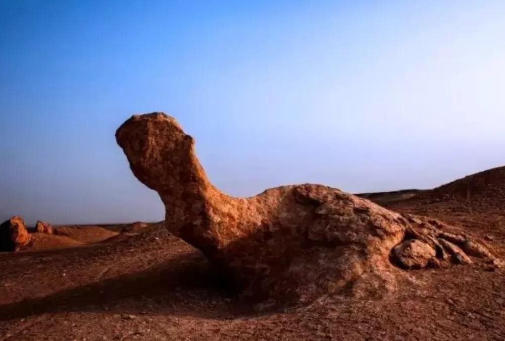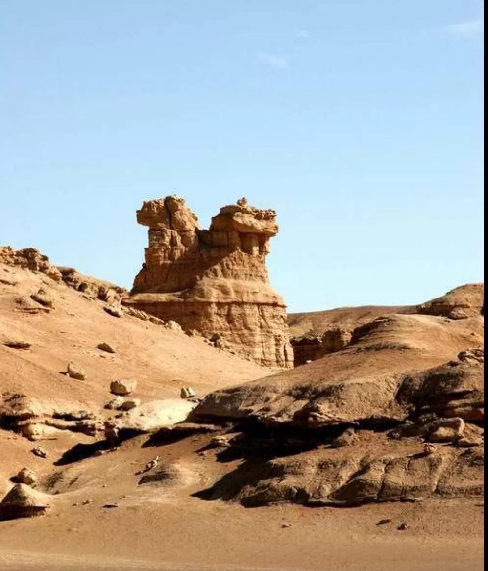 在魔鬼城里,我们参观的第一个景点名为瀚海神龟。大家看这座地形酷似一个仰天侧望的神龟。道光二十六年,《哈密志》记载:“鳖盖梁在天生墩东,沙土生成,具形宛如龟,首尾俱全。”可见我国在清代就对雅丹地貌有详细记载,不过当时不叫雅丹地貌,而称为“天生墩”。