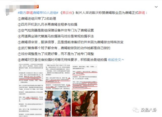 很快,《燕云台》的总制片人季风也回应称这纯属无稽之谈,表示唐嫣只带了两名工作人员,即使剧组辗转多地,唐嫣全程都参与,还没有过任何的特殊要求,同时还称赞唐嫣是个非常敬业和专业的好演员。