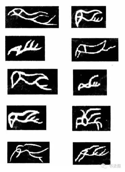 甲骨文书法的结体,为汉字的字形之态奠定了基础,其字体大都以长方形为主(长方形字体占75%,方形字体占20%,扁方形字体占5%),在占绝大多数的长方形字形中其形体都是5:8和5:3的形态,这种长方形符合黄金分割比率的原则,是一种最美、最合度的形体。汉字是在象形字为主体的基础上发展起来的,在甲骨文中象形字占有相当的数量,一些非象形的会意字、形声字,就其构成的各个部件来说也都是以象形为母体,所以说甲骨文的象形字,真正体现了“画成其物,随体诘诎”,概括地表现出物象最基本和最富有特色的那部分。正由于字体具有象形的特点,在结体上随体赋形,任其自然,而且往往一个字有很多种不同的字形体态,使甲骨文字的结构更加“千姿百态”。如图2所示,这10个“鸟”字,即可看出结构有别、体态不同、情趣各异——有的安详栖息,有的昂首鸣转,有的注视前方,有的环顾背后,有的刚刚降落,有的正欲飞翔,一个个活灵活现,神气十足。所以,甲骨文的字体结构虽以端正为基础,却不拘于端正,在字的结构上常常显示出灵活性、生动性和多样性。其形体态势的长短大小、斜正疏密,因势而行,不拘一格,又以一个重心为基础,使其参差错落,穿插迎让,偃仰开合,顾盼呼应,动静起伏,在灵活自由、错综变化中,又显得均衡、对称、稳定。甲骨文的结体重视构形上的稳中有动、欹中有正,既能体现恣意的创作情感,又合理自然、不着雕痕,体现了书家对宇宙法则和造化神工的体认。