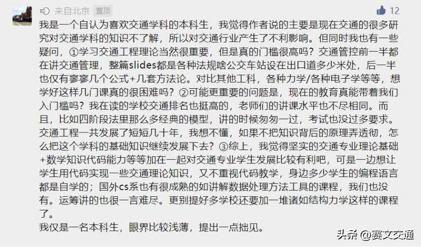 引起笔者关注的是一条来自一名交通专业本科学生的评论,他提出了自己作为交通工程本科学生对于学校教学内容的几点疑惑和思考,包括对交通工程理论门槛很高的不解,对目前学校教学是否能带着学生们进入交通门槛的质疑,对学科的基础知识是否应该被重视的思考,对交通工程专业核心授课内容应该是什么、是否需要具备编写代码能力等等的疑惑,值得整个行业反思。