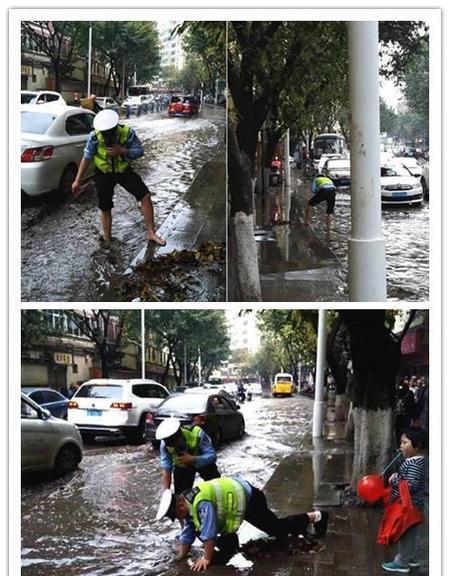 就像这两位俯身徒手掏树叶的交警。暴雨过后的街道,城市排涝系统被严重堵塞。过往车辆都小心翼翼着,严重影响通行速度。两位交警二话不说,撸起袖子就俯身下去。排污疏通本不是他们的工作范围,但他们在最需要的时候做了这件本不是自己的事情!