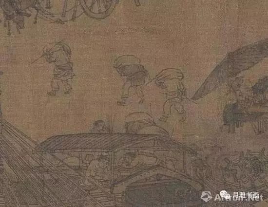 清院本也是如此,交通秩序很好,车马各行其道,街头也没有贩夫占道的现象,只是船夫进行了“技术革新”,纤绳没有系在桅杆上,而是系在船头,这样减去了许多麻烦(图7)。