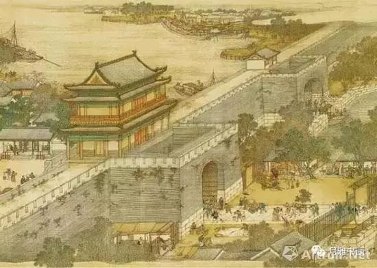 再比较清院本,城门口也是有人看守的,不过画家已经不画这个千斤闸了,清代苏州城已经没有倭患了(图14)。