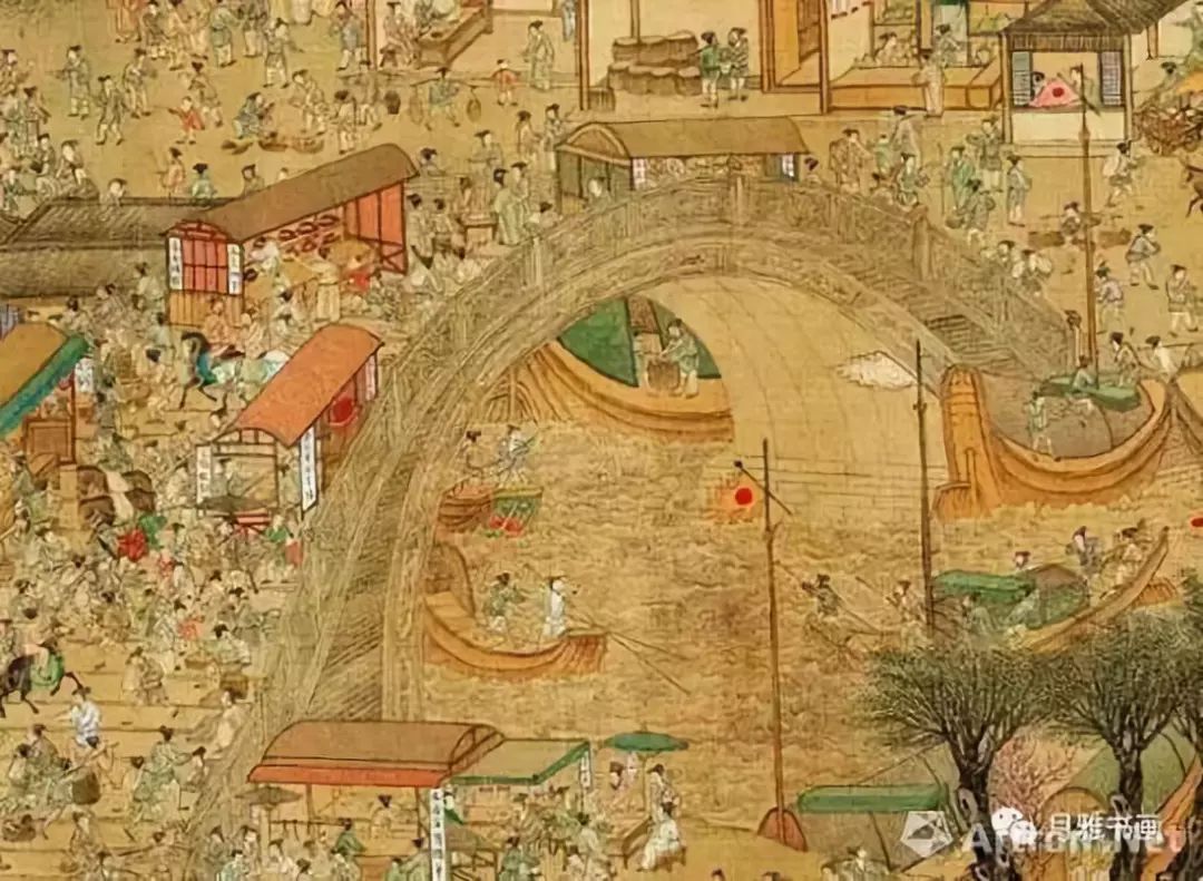 三幅《清明上河图》首先从色彩上看,张择端的设色很少,明清本子则是青绿设色,画的也比张择端的本子长,色彩气氛要热烈得多。