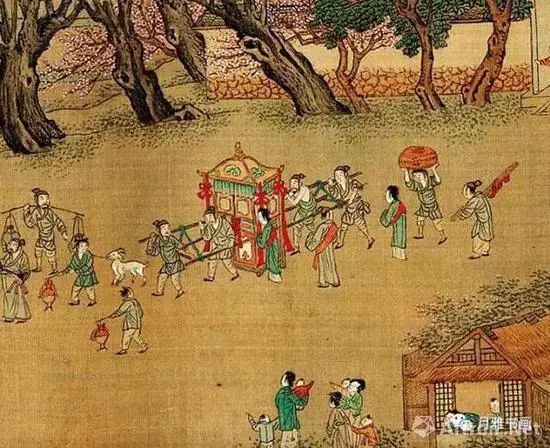 比较一下明清的本子,很是热闹。明本开卷就是画结婚娶亲时的情景(图4),清院本结婚的铺张场面,吹吹打打,更是气派(图5)。要知道,在所有的黄历里,哪朝哪代的清明节都不是结婚的日子。