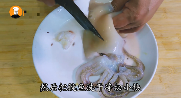 6、再把鱿鱼从中间剪开,去除内脏,留下鱿鱼肚里面的一条鱿鱼膏,把鱿鱼背上的一条透明状的长条拉去,然后把鱿鱼表皮一层膜拉掉,然后把鱿鱼洗干净切小块
