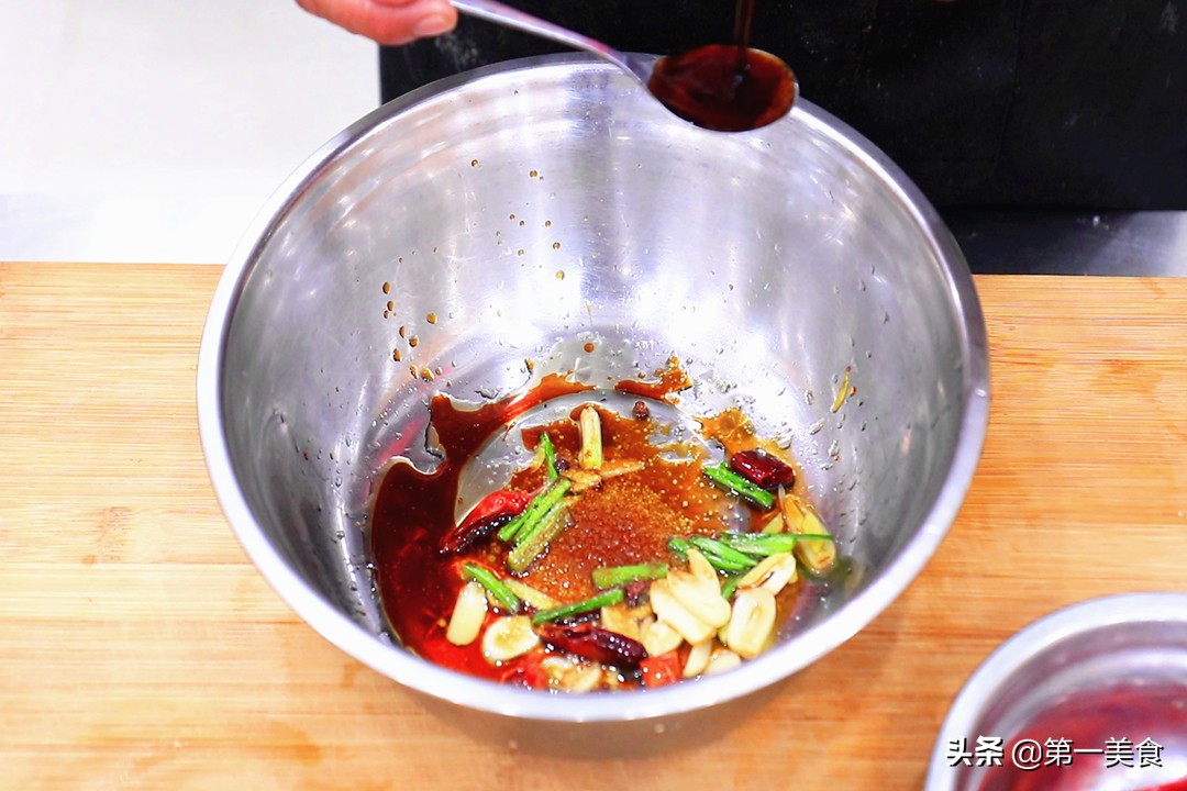 4.然后把小料倒出来晾凉,往里面加入两勺蒸鱼豉油、一勺白糖、适量的陈醋搅拌均匀备用。