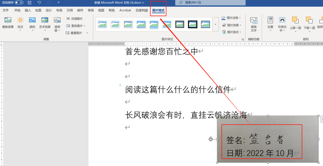 由于我们拍照得到的签名背景色,与Word洁白的背景格格不入,需要进一步调整