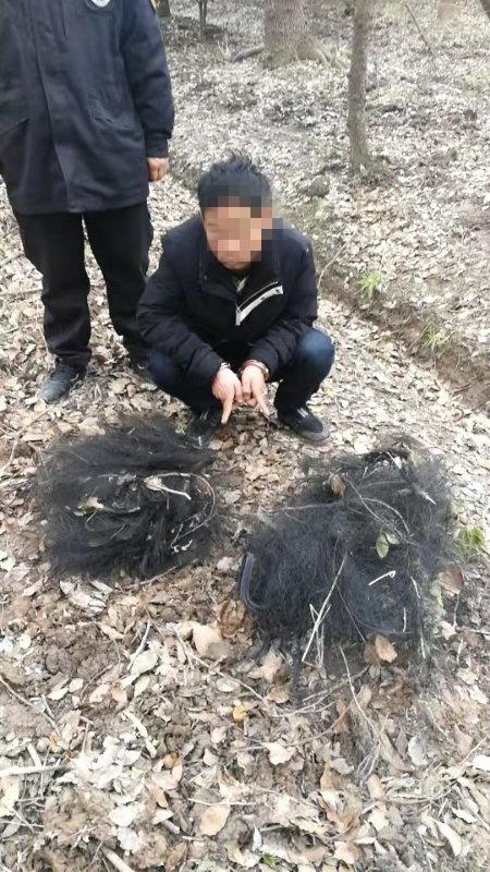 犯罪嫌疑人指认捕鸟网。浦东警方供图