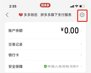 【2】进入多多钱包页面之后,点击右上角齿轮状的图标,这是多多钱包的设置功能;