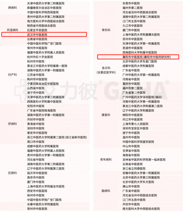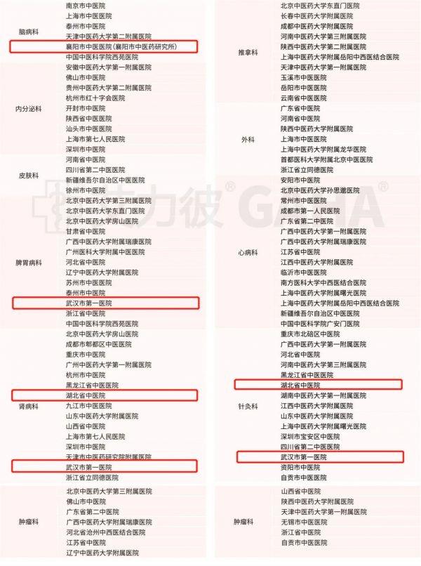 武汉市第一医院排名第22位,襄阳市中医院(襄阳市中医研究所)排名第54位,湖北省中西医结合医院排名第91位。据了解,三家医院已连续多年入选中国百强中医院。