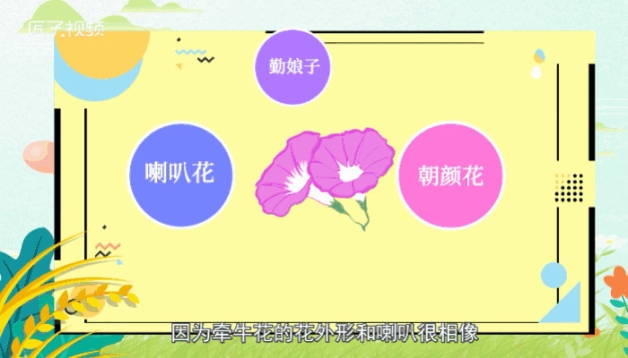 牵牛花的别名有很多,比如喇叭花、朝颜花、勤娘子等。因为牵牛花的花外形和喇叭很相像,所以才叫喇叭花。而朝颜的名称来源,则是因为它在清晨开花,傍晚花谢,只能在白天看到。与朝颜花相对的则是夕颜花,也就是葫芦花,它在黄昏开花,凌晨花谢。