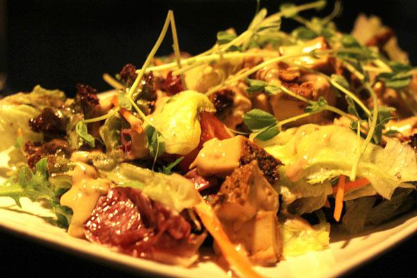 烤鸡胸沙拉佐水蜜桃酱,水蜜桃酱滑爽和彩叶生菜与干涩的烤鸡胸搭配,让菜品有了滑爽的口感。色彩鲜艳、菜品种类繁多,菜、肉搭配营养丰富。煎小土豆配黑芝麻,是一道不错的代替粮食的小菜,土豆切成小块,四面都煎的微黄,嚼在嘴里绵软的口感,带着黑芝麻的香气。盘底的螺旋线画盘,仿佛把土豆穿连在一起,煎熟的西红柿就像项链上的红玉坠。